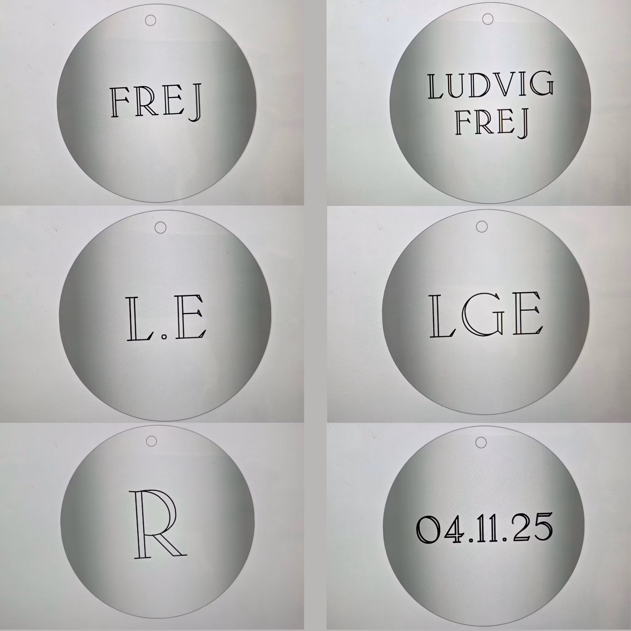 Två Namn(Är endast tillgänglig till den stora brickan!): Max 8 tecken per namn! Det namnet som du skriver först står högst upp på brickan. Skriv enligt följande exempel: (Ludvig)(Frej)(Punkter räknas även som tecken)