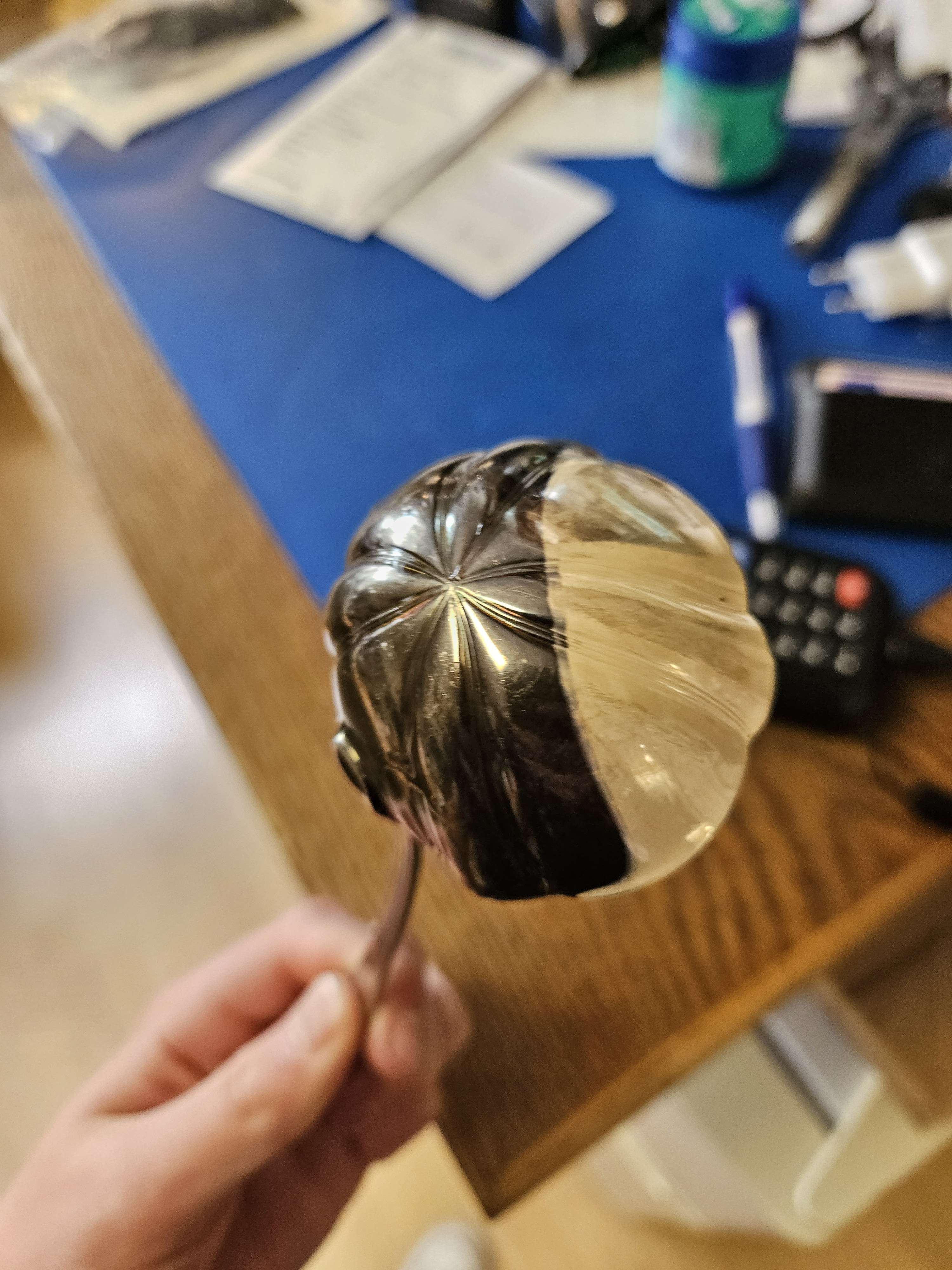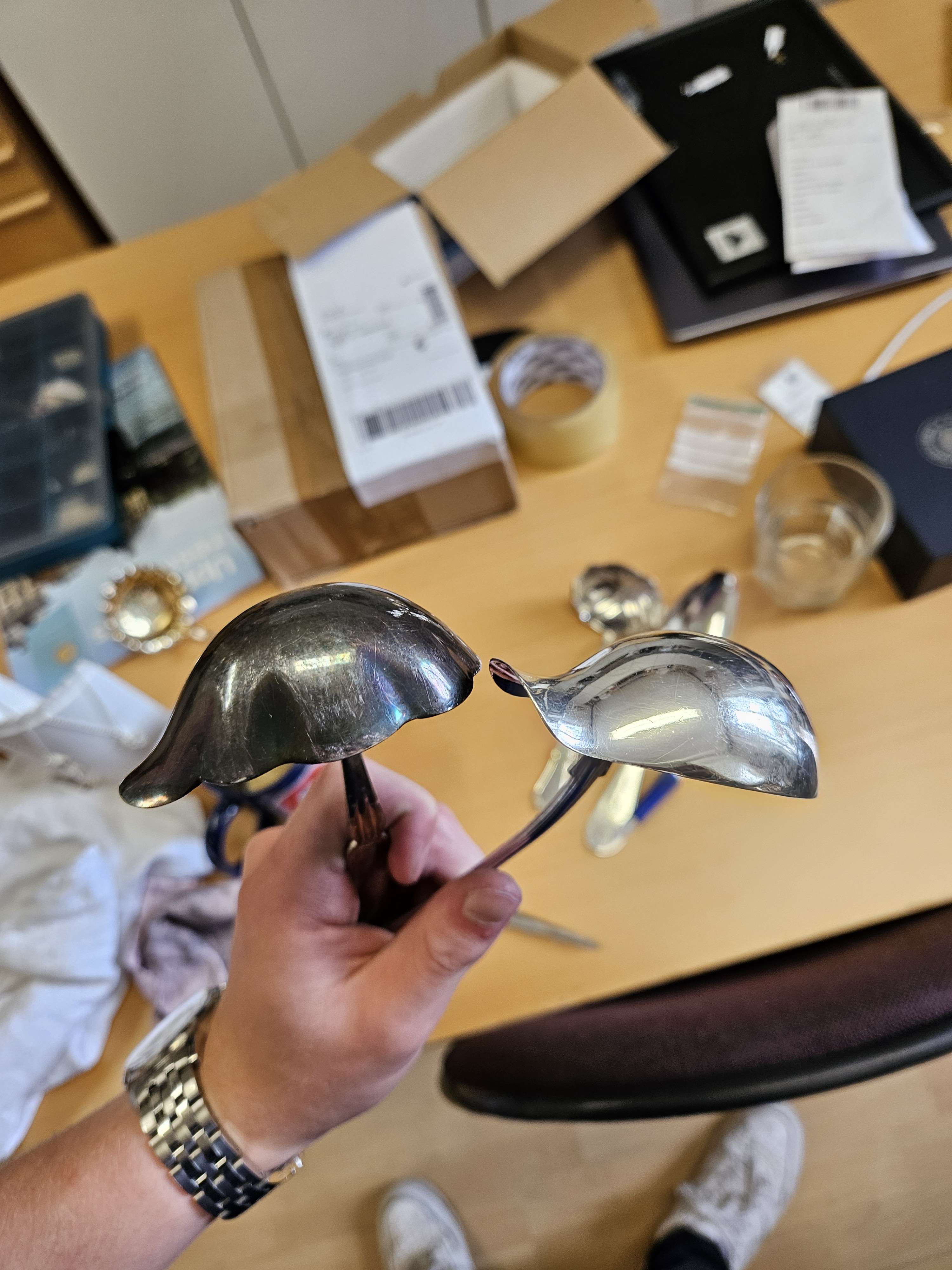 Har du märkt att ditt silver inte blänker lika fint som tidigare? Silver är ett material som oxiderar med tiden när de kommer i kontakt med ljus och syre. Detta är helt normalt och det är absolut inget fel med din produkt. Men det kan vara klokt att ha en liten putsduk innerfickan för att hålla skenet uppe! Här ser du skillnaden mellan en nyputsad silverslev och en slev som har väntat alldeles för länge på att bli putsad